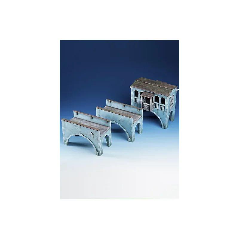 Jede einzelne Brücke hat eine Grundfläche von ca. 11 x 6 cm und eine Höhe von ca. 9 cm. Die mittlere Brücke mit dem Gebäude hat Grundfläche eine Höhe von ca. 12 cm und eine Breite von ca. 10 cm mit den Balkonen.