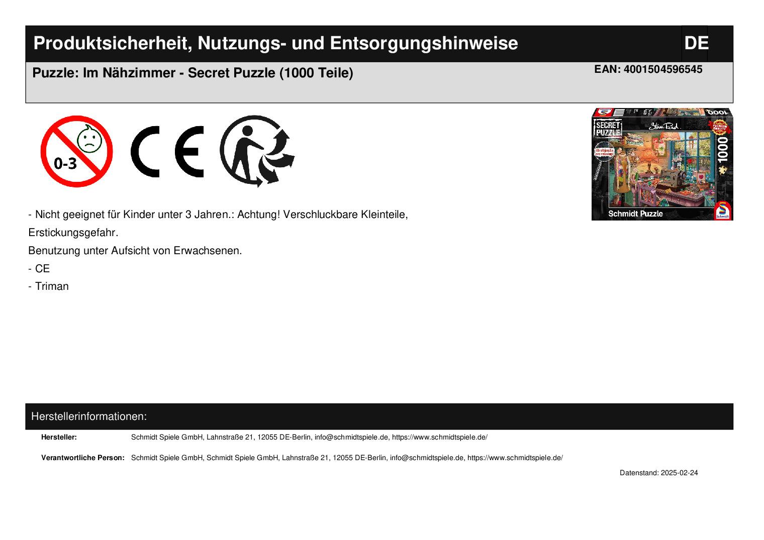 Schmidt Spiele GmbH Lahnstraße 21 12055 Berlin info@schmidtspiele.de https://www.schmidtspiele.de/ WEEE-Nummer: