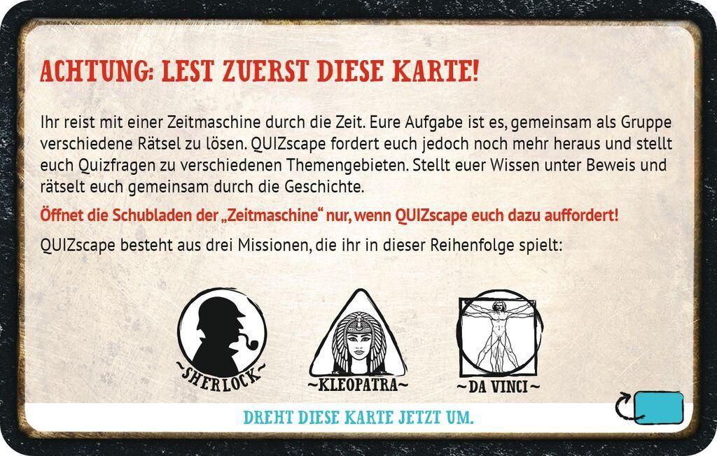 Eine Schachtel voller Überraschungen, drei spannende Zeitreise-Abenteuer und eine einzigartige Kombination aus Quizfragen und Escape-Feeling – das ist QUIZscape. Das neuartige Spielkonzept ist perfekt für Einsteiger geeignet und ermöglicht einen schnellen Spieleinstieg. Anders als bei anderen Escape-Games lässt sich das Spiel komplett in den Ursprungszustand zurücksetzen, das gesamte Material bleibt unversehrt.
