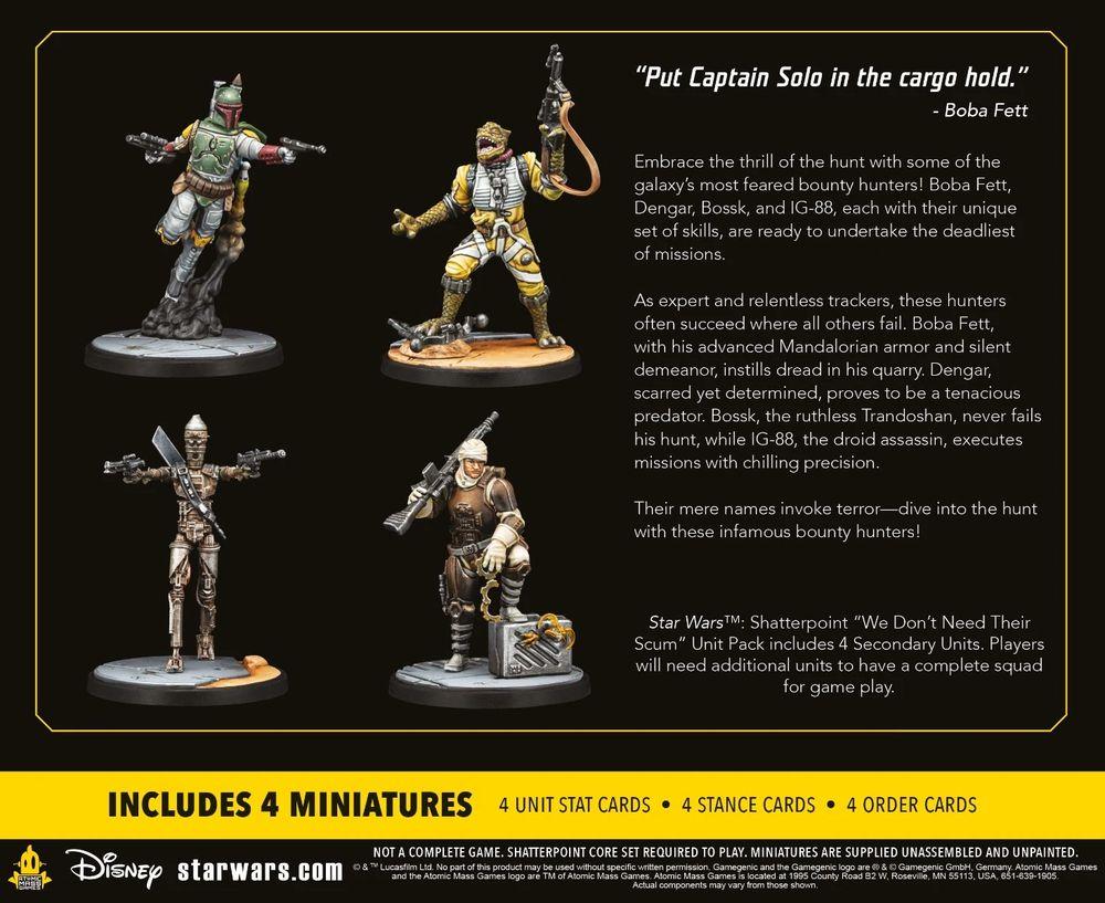 Der Squad-Pack „Diesen Abschaum brauchen wir nicht” beinhaltet die gefährlichen Kopfgeldjäger Boba Fett, Dengar, Bossk und IG-88 zum Erstellen eines Einsatzteams für das Skirmish-Miniaturenspiel Star Wars™: Shatterpoint.