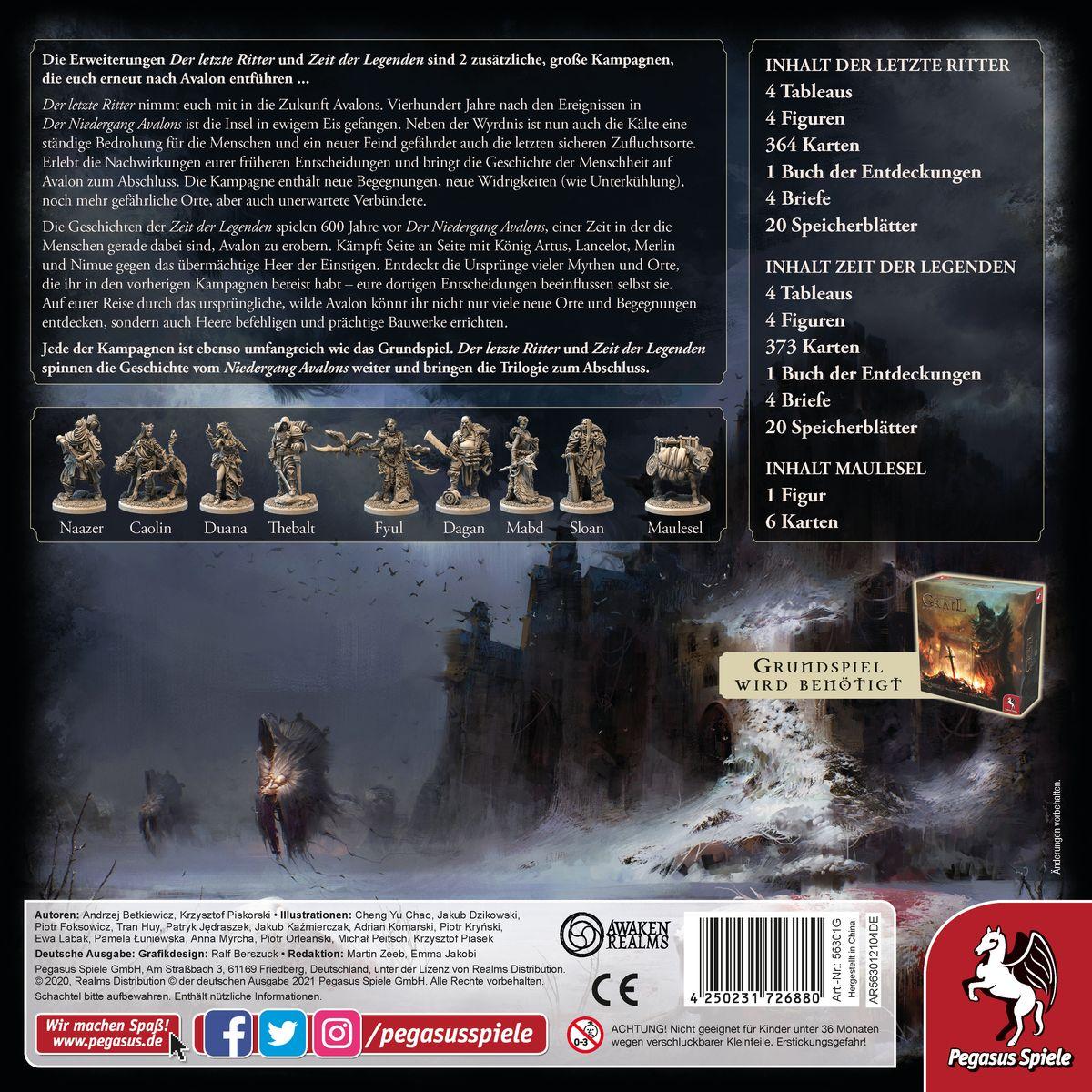 Die Spieler kämpfen Seite an Seite mit König Artus, Lancelot, Merlin und Nimue gegen das übermächtige Heer der Einstigen. Dabei entdecken sie die Ursprünge vieler Mythen und Orte, die sie in den vorherigen Kampagnen bereist habt – ihren dortigen Entscheidungen werden auch hier deutlich. Auf ihrer Reise durch das ursprüngliche, wilde Avalon können sie nicht nur viele neue Orte und Begegnungen entdecken, sondern auch Heere befehligen und prächtige Bauwerke errichten. Jede der Kampagnen in dieser großen Erweiterung ist ebenso umfangreich wie die des Grundspiels. Der letzte Ritter und Zeit der Legenden spinnen die Geschichte vom Niedergang Avalons weiter und bringen die Trilogie zum Abschluss.