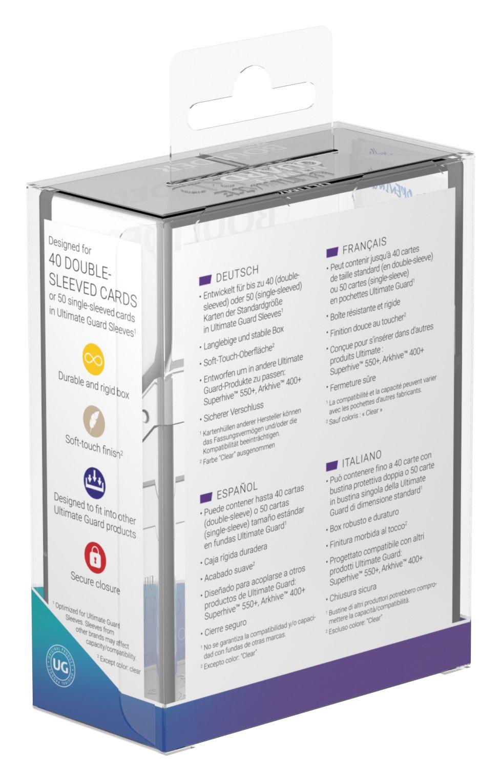- Designed für bis zu 40 (double-sleeved) oder 50 (single-sleeved) Karten der Standardgröße in Ultimate Guard Sleeves