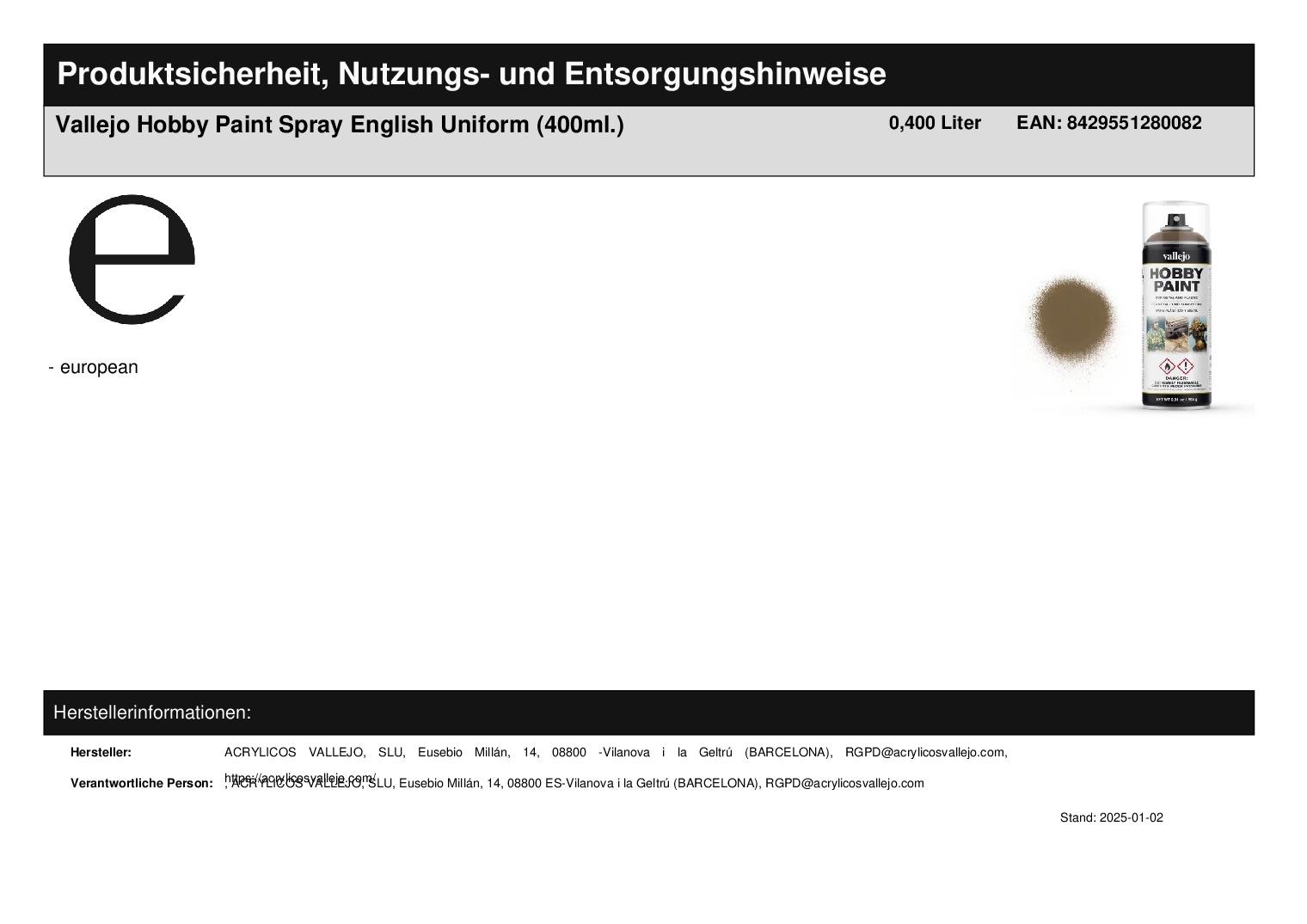 Produktinformationen "Vallejo Hobby Paint Spray English Uniform (400ml.)"