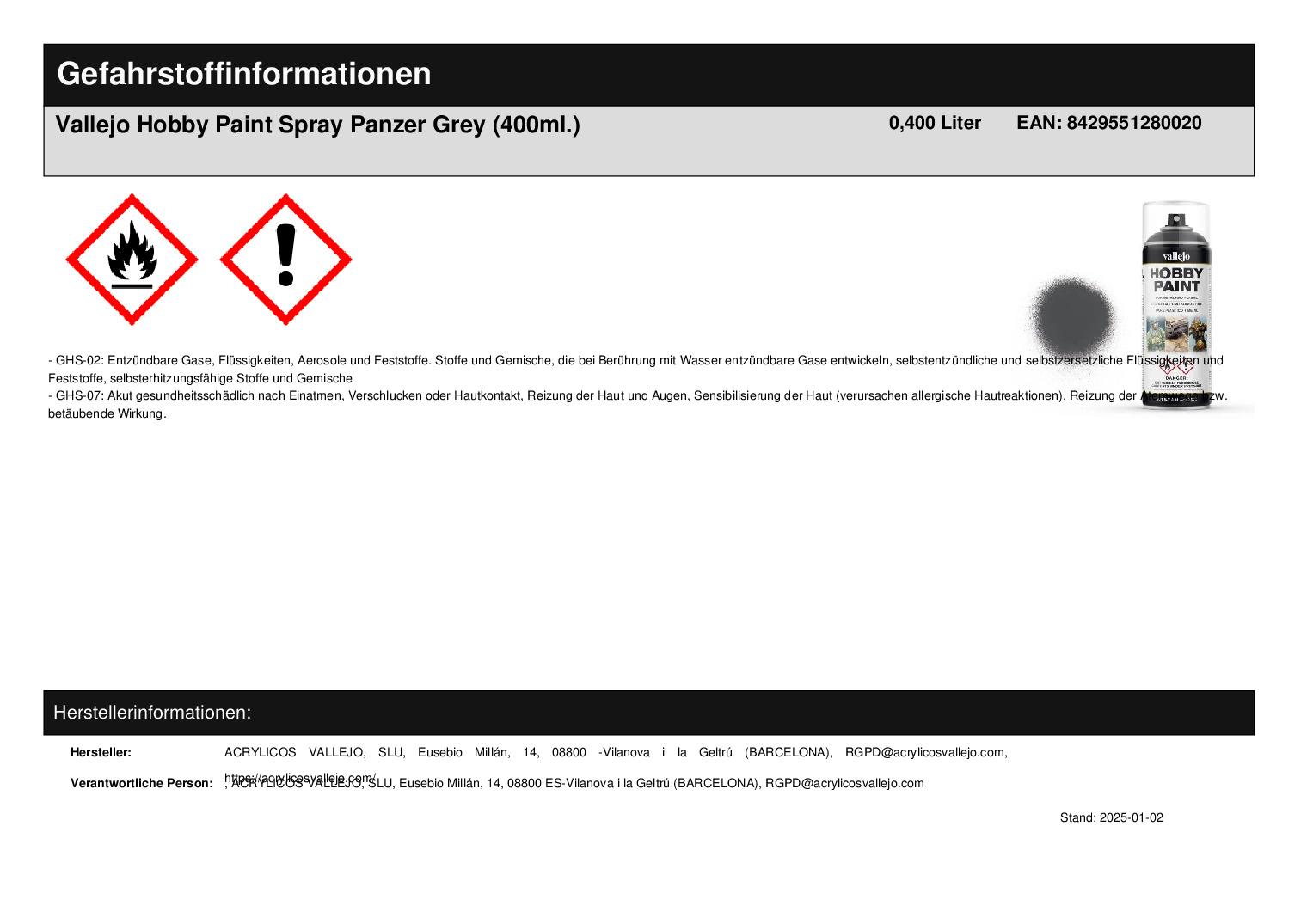 Produktinformationen "Vallejo Hobby Paint Spray Panzer Grey (400ml.)"