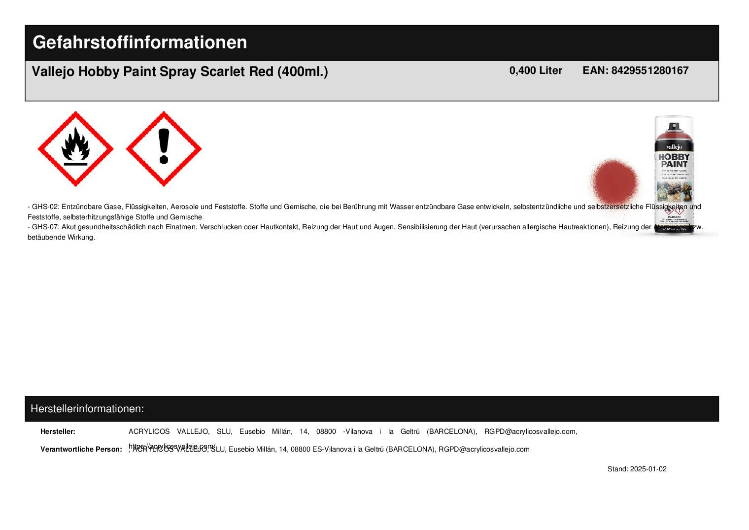 Produktinformationen "Vallejo Hobby Paint Spray Scarlet Red (400ml.)"