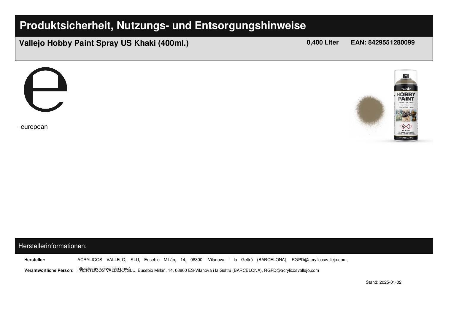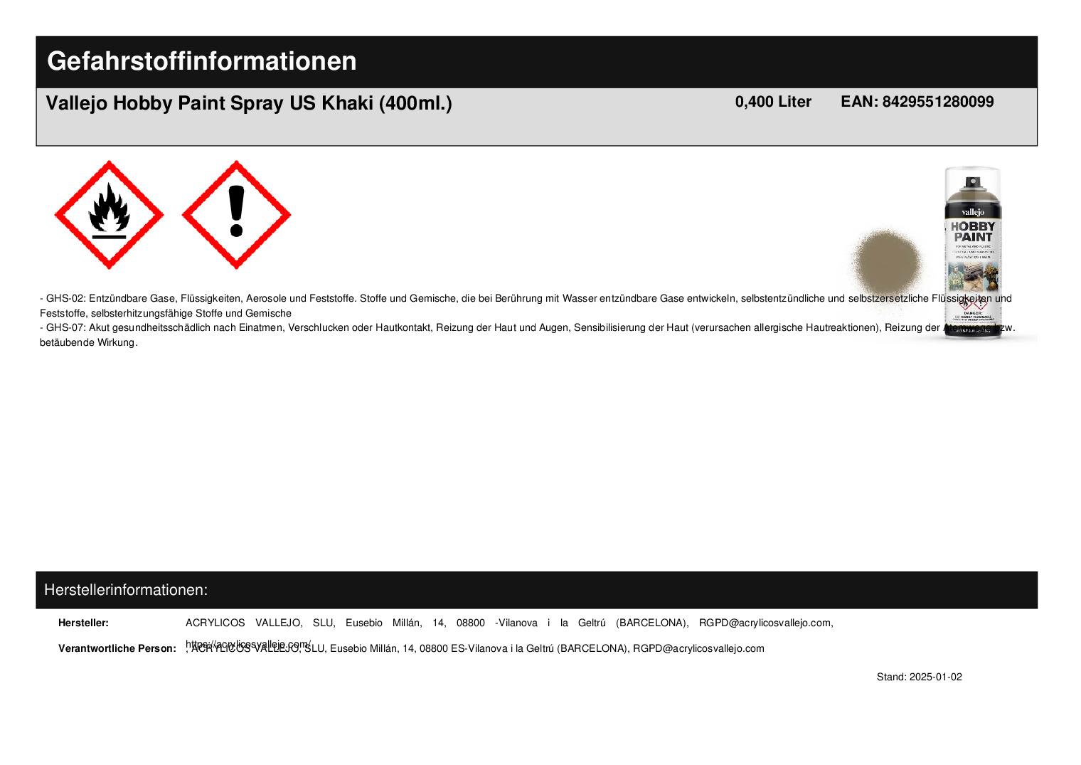 Produktinformationen "Vallejo Hobby Paint Spray US Khaki (400ml.)"