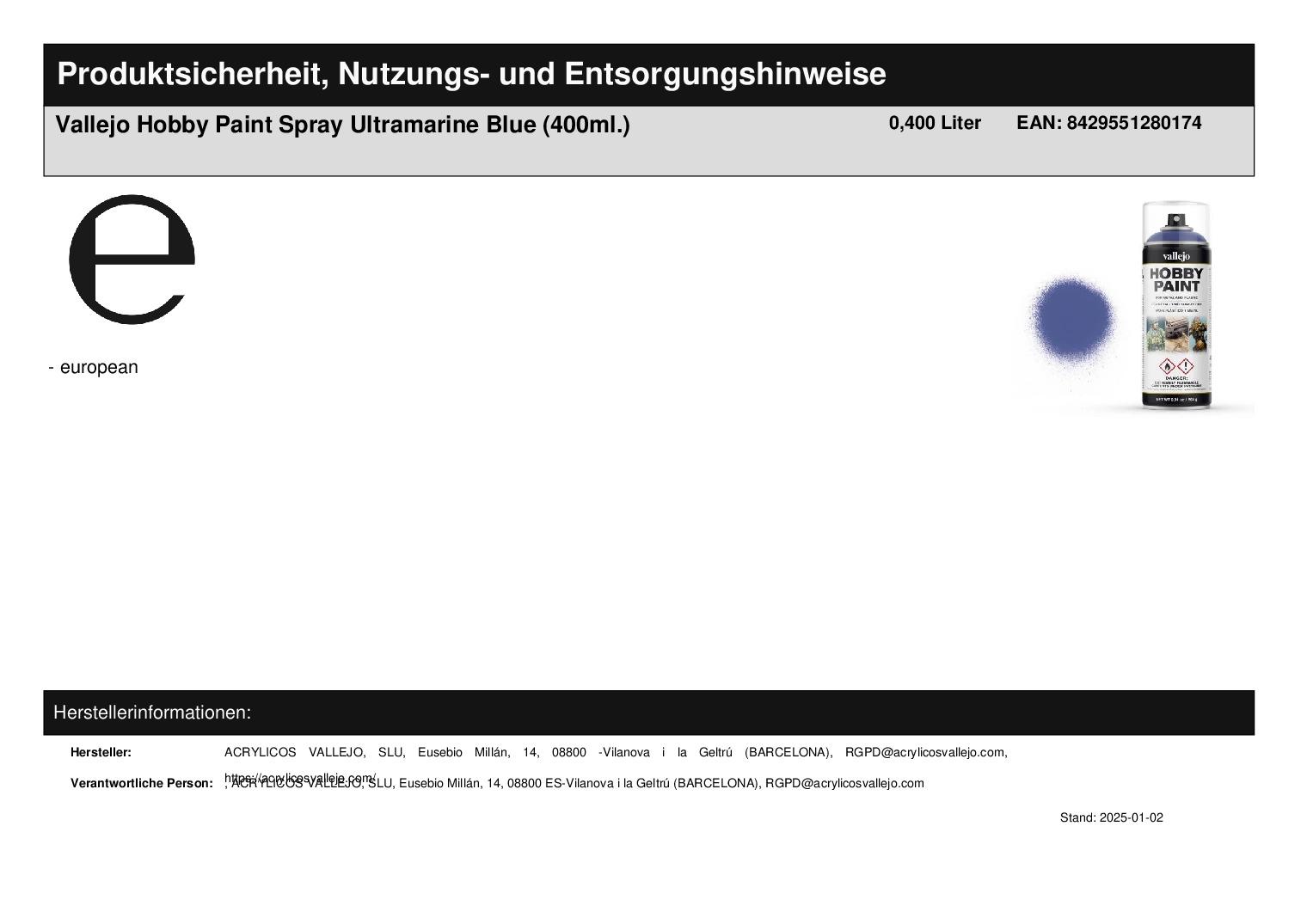 Produktinformationen "Vallejo Hobby Paint Spray Ultramarine Blue (400ml.)"