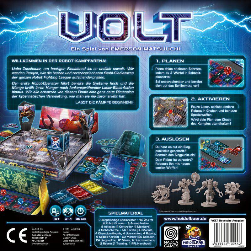 VOLT ist eine komplett überarbeitete und erweiterte Neuauflage von Emerson Matsuuchis VOLT: Robot Battle Arena. Das Spiel ist dank seiner einfachen Grundregeln, seinen spannenden Unwägbarkeiten und den taktischen Möglichkeiten im fortgeschrittenen Spiel sowohl für Familien als auch für Vielspieler geeignet. VOLT beinhaltet außerdem ausgeklügelte K.I.-Regeln für das Spiel mit 2–3 Spielern sowie eine Turniervariante.