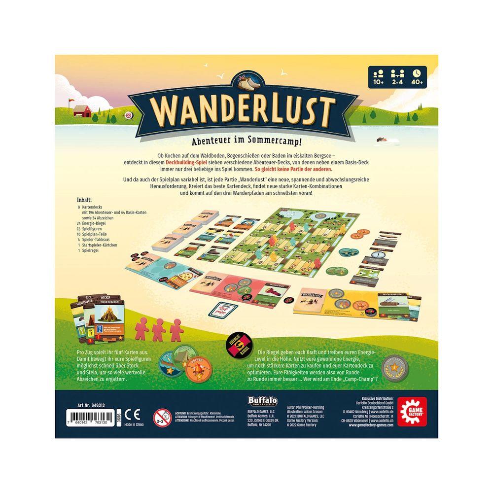Ob Kochen auf dem Waldboden, Bogenschiessen oder Baden im eiskalten Bergsee - entdeckt in diesem Deckbuilding-Spiel sieben verschiedene Abenteuer-Decks, von denen neben dem Basis-Deck immer nur drei beliebige ins Spiel kommen. So gleicht keiner Partie der anderen. Und da auch der Spielplan variabel ist, ist jede Partie Wanderlust eine neue, spannende und abwechslungsreiche Herausforderung. Kreiert das beste Kartendeck, findet neue starke Kartenkombinationen und kommt auf den drei Wanderpfaden am schnellsten voran!