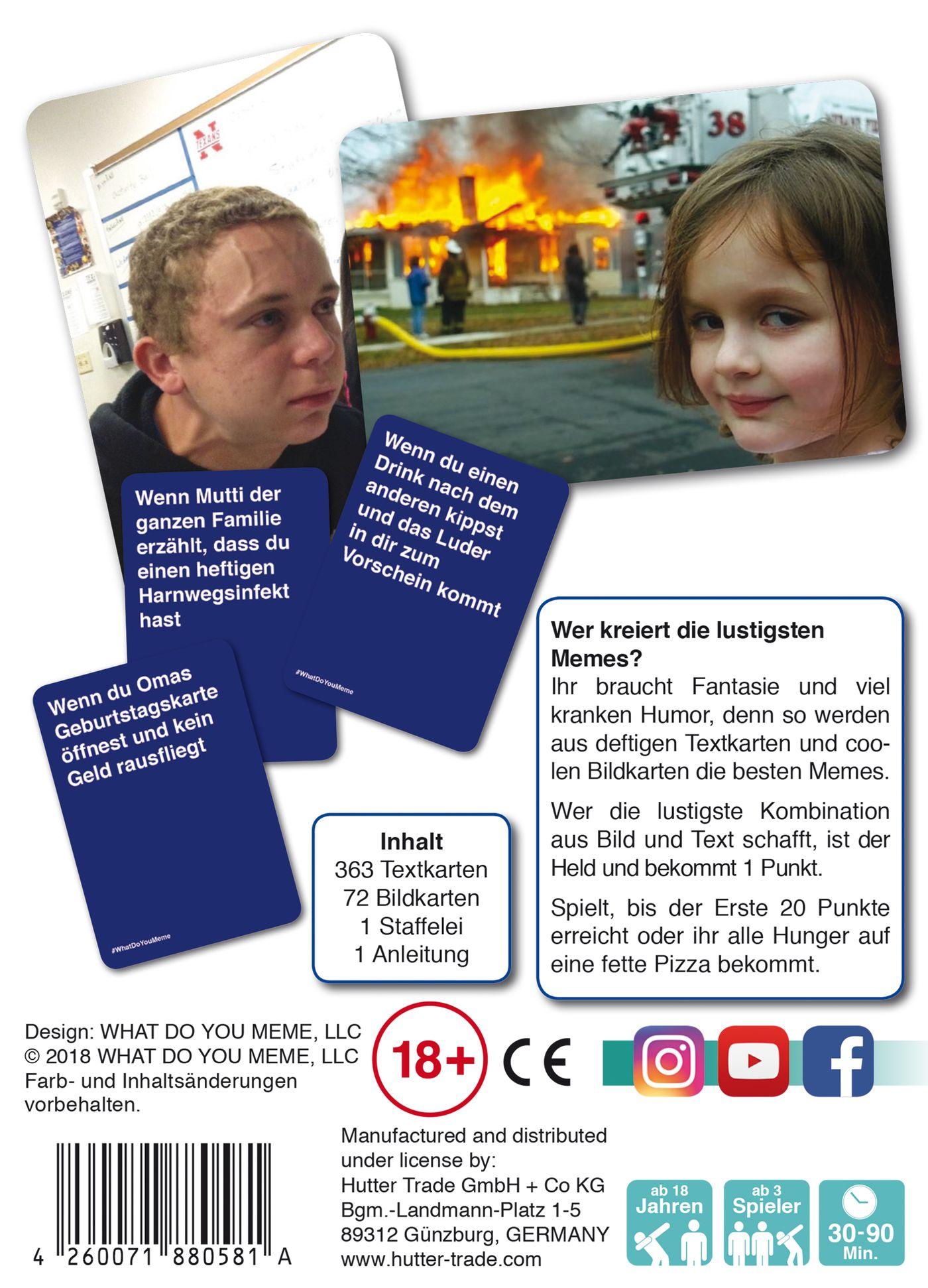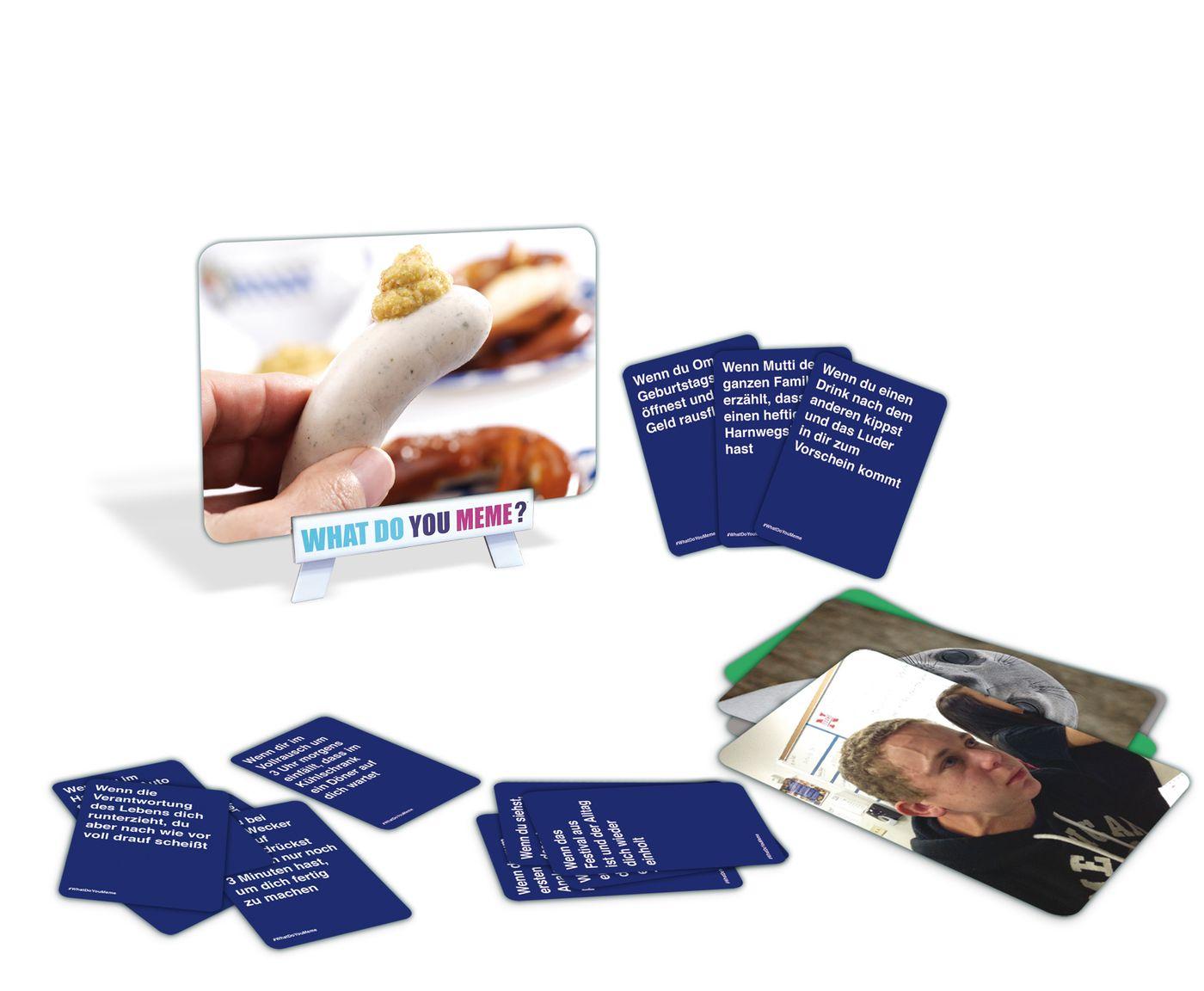 In jeder Runde ist einer aus der Runde der Punktrichter. Er wählt eine der großformatigen Bildkarten aus und zeigt sie seinen Mitspielern. Diese wählen dann passend zum Bild eine ihrer Textkarten aus und schieben diese verdeckt dem Punktrichter zu. Der Text, der am besten, lustigsten oder einfach am verrücktesten zum ausliegenden Bild passt, punktet und kreiert damit ein neues Meme - ohne WLAN, Upload und Datenvolumen.