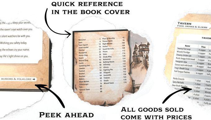 Each location chapter is structured around common player questions and actions. Whether your party wanders into a shop, tavern, shady alleyway, or street market, you’ll instantly find greetings, shop names, flavor text, descriptions, purchasable items, and NPC details, right where you need them, exactly when you need them. You’ll never have to keep your players waiting!