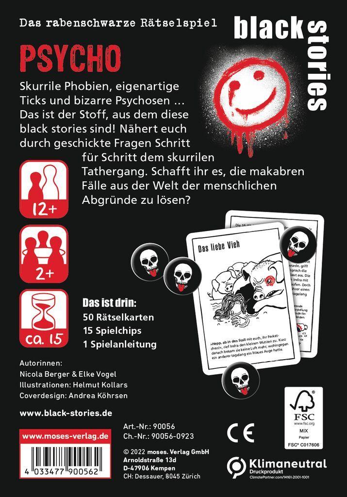 Skurrile Phobien, bizarre Psychosen, eigenartige Ticks und die ganze Bandbreite kurioser psychischer Störungen bieten jede Menge Stoff für rabenschwarze Rätsel. Medizinisches oder psychologisches Grundwissen ist nicht erforderlich, aber zu manischem Fragen, Raten und Tüfteln wird dringend geraten! In den black stories Psycho warten 50 rabenschwarze Rätsel aus den Abgründen dermenschlichen Seele natürlich samt Erklärung einzelner Fachbegriffe für die Extraportion Psychologie-Wissen!