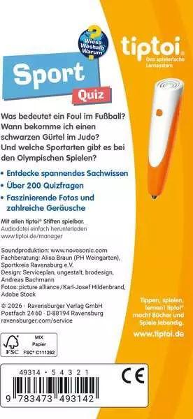 Was bedeutet ein Foul im Fußball? Welche Sportarten gibt es bei den Olympischen Spielen? Und wann bekomme ich einen schwarzen Gürtel im Judo? Dieses tiptoi Quiz beantwortet spannende Kinderfragen auf Augenhöhe und vermittelt so spielerisch Sachwissen. Von Basketball bis Rope Skipping lernen Kinder ab 4 Jahren dabei verschiedene Sportarten kennen. Über 200 Quizfragen, tolle Fotos und zahlreiche Geräusche motivieren zum selbstständigen Entdecken und garantieren ein abwechslungsreiches Spiel.